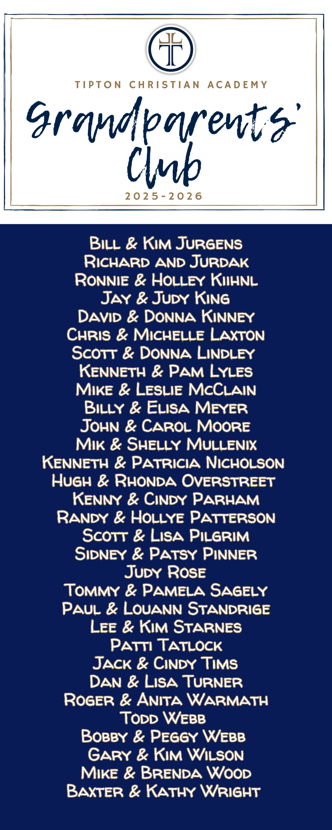 Ready to join the club? CLICK HERE to download the form, complete it and mail it to the address listed. You can contact Lori Beth Belk at lbbelk@tiptonchristianacademy.com or 901-701-1323 with any questions.